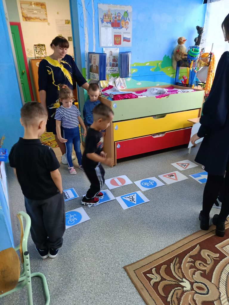 1 станция — «Дорожный знак», на ней дошколята прыгали по принципу «классиков» по дорожным знакам до задания «собери картинку».
